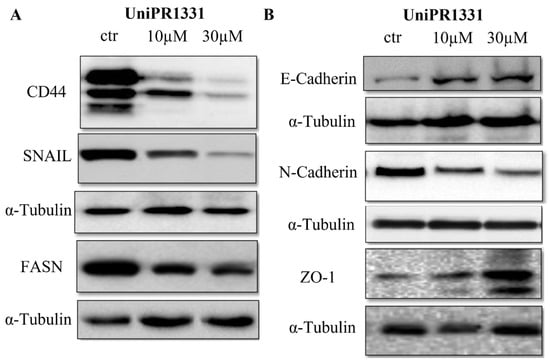 (A) Western blotting analysis of UniPR1331-treated PC3 cells for CD44, SNAIL and FASN. (B) Western blotting analysis of UniPR1331-treated PC3 cells for E-Cadherin, N-Cadherin and ZO-1.
