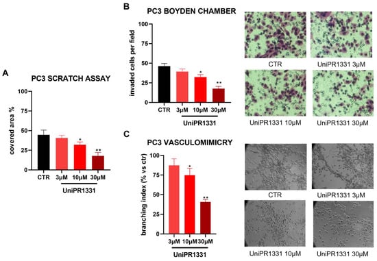 It is well established that EMT increases the migration and invasion capabilities of cancer cells, including in prostate cancer [29]. The detrimental effects of UniPR1331 on PC3 EMT markers prompted us to investigate if UniPR1331 treatment could affect PC3 migration, invasion, and vasculomimicry capabilities. As shown in Figure 4A, UniPR1331 was able to inhibit, in a concentration-dependent manner, PC3 migration, as well as the Matrigel invasion (Figure 4B). Finally, the incubation of UniPR1331 with PC3 seeded on Matrigel inhibited the vasculomimicry process in a concentration-dependent manner (Figure 4C).