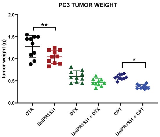 Comparisons amongst treatments in terms of final tumor weight in PC3-xenograft nude mice after 5 weeks of treatment. One-way ANOVA followed by Tukey’s post-test was used to compare all the groups to control group, * p < 0.05, ** p < 0.01. CTR was significantly different from any treatment or association and UniPR1331 was significantly different from DTX, CPT, and their associations (data not reported in the graph for simplicity). All the groups passed Shapiro–Wilk normality test.