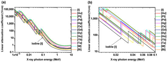 Linear X-ray attenuation coefficients [4] of heavy metal atoms and I versus X-ray photon energy between (a) 1 keV and 10 MeV and (b) 10 and 100 keV (clinical energy area).
