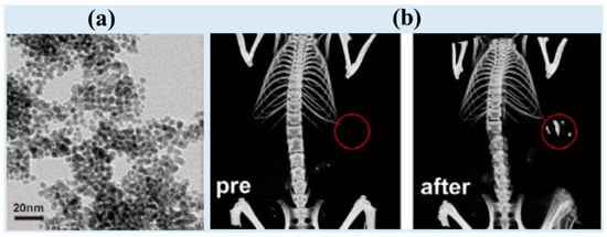 Lyu et al. synthesized cysteamine-coated FePd bimetallic nanodots (d = 3.4 nm) (Figure 2a) as trimodal CT-MRI-photoacoustic (PA) imaging agents [24]. FePd bimetallic nanodots were synthesized using NaBH4 as a reducing agent in a nitrogen atmosphere and then coated with cysteamine for colloidal stability and biocompatibility via sonication in ethanol. They obtained an X-ray attenuation efficiency of 2.6 HU/mM, higher than that of the commercial iodine contrast agent Iopromide (2.0 HU/mM). In addition, high contrast enhancement was observed in the in vivo CT images of BALB/c mice at the tumor site (red circles in Figure 2b) 12 h after intravenous injection (dose = 50 μL, 10 mg Pd/mL) (Figure 2b). The nanodots offered excellent CT signal augmentation and showed exceptional stability and biocompatibility. In addition, they were applied to in vivo thermoradiotherapy (photothermal therapy combined with radiation therapy).