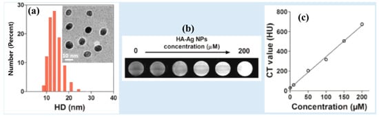 (a) Histogram of the hydrodynamic diameter (HD) distribution of HA-Ag-NPs based on dynamic light scattering (DLS) and cryo-TEM (inset). (b) Phantom images as a function of Ag concentration. (c) CT values (i.e., X-ray attenuation) of HA-Ag-NPs as a function of Ag concentration [26].