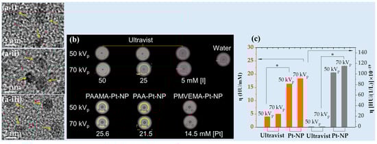 (a) TEM images of (i) PAA-, (ii) PAAMA-, and (iii) PMVEMA-coated Pt-NPs. The arrows indicate NPs. (b) Phantom images at 50 and 70 kVp. (c) Histogram of X-ray attenuation efficiency. *: p < 0.05, the significance of the results was confirmed using a t-test. The commercial iodine contrast agent Ultravist was used as a reference [57].