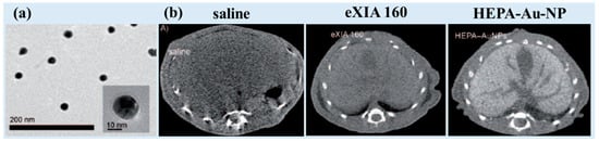 (a) TEM image of HEPA–Au-NPs. (b) Cross-sectional in vivo micro-CT images of the liver 2 h after the injection of saline, eXIA 160 (800 mg I/kg), and HEPA-Au-NPs (250 mg Au/kg) [80].