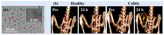 (a) TEM images of Dex-Ce-NPs (inset: 5 nm scale). (b) CT images of healthy (left) and colitis (right) mice obtained before (labeled as “pre”) and 24 h after the oral administration of Dex-Ce-NPs. The yellow dashed circle indicates CT contrast as Dex-Ce-NPs accumulated in the colitis-affected region 24 h after injection [29].