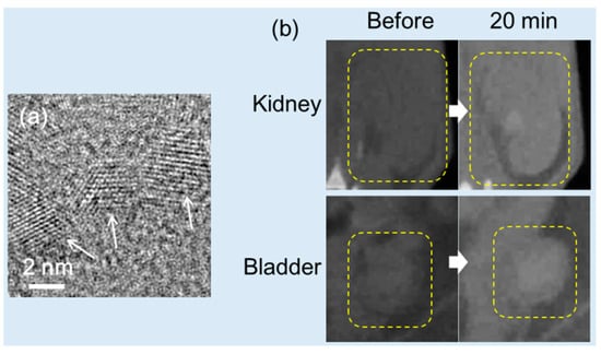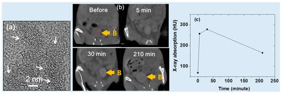 (a) HRTEM image of ultrasmall Gd2O3 NPs coated with the iodine compound (i.e., C8H4I3NO4) (indicated by the arrows). (b) In vivo CT images of a mouse bladder (marked B) at 70 kVp. The red circle indicates region of interest (ROI). (c) X-ray absorption of the ROI of the bladder (indicated by the small dotted circle) (B) before and after the intravenous injection of an aqueous NP sample into the mouse’s tail [31].