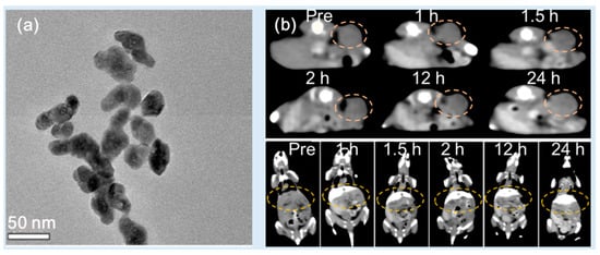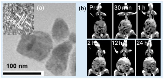 Liu et al. synthesized 1,2-distearoyl-sn-glycero-3-phosphoethanolamine-N-methoxy(polyethylene glycol)-3000 (DSPE-PEG)-coated TaS2 NSs (PEG-TaS2 NSs) (d = 50–100 nm and HD = ~110 nm) for safe and efficient cancer treatment (Figure 10a) [50]. The TaS2 NSs were synthesized using the combinatorial grinding of bulk TaS2 and sonication processes and then coated with DSPE-PEG in aqueous media. The PEG-TaS2 NSs demonstrated high X-ray attenuation (6.3 HU/mM) at 120 kVp (similar to that of Iobitridol). After intravenous injection (4.5 mg Ta/kg), contrast enhancements at the liver (Figure 10b) were observed, demonstrating the potential of the NSs as CT contrast agents. The PEG-TaS2 NSs showed extended circulation times due to the PEG coating [20,21,22], making them useful for in vivo imaging and drug delivery, as well as cancer theranosis through the EPR effect.