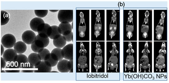 (a) TEM images of Yb(OH)CO3 NPs. (b) In vivo CT images of rats before and after the injection of Yb(OH)CO3 NPs (right) and Iobitridol (left) at 120 kVp [44].