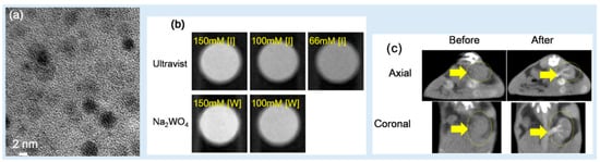 Kim et al. studied the use of D-glucuronic acid-coated Na2WO4 NPs as CT contrast agents [51]. The D-glucuronic acid-coated Na2WO4 NPs were synthesized through using a one-pot polyol method. The average particle diameter of the NPs was 3.2 nm (Figure 11a). In vitro phantom images showed stronger X-ray attenuation than that obtained using Ultravist at 70 kVp (Figure 11b); the X-ray attenuation efficiency of the NPs was ~10 HU/mM, whereas that of Ultravist was ~4.5 HU/mM. In addition, in vivo CT images showed contrast enhancements at the kidneys after intravenous injection (0.1 mmol W/kg) at 70 kVp (Figure 11c). This dose is much lower than that of the iodine contrast agents (2–6.4 mmol I/kg), indicating that the D-glucuronic acid-coated Na2WO4 NPs can be used as CT contrast agents.