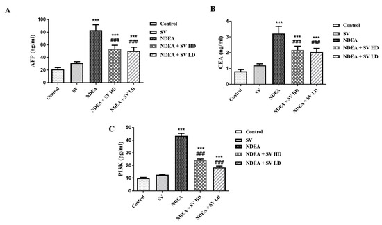 The results indicated that NDEA-treated rats displayed significant elevations (at p < 0.001) in AFP (291.8%), CEA (257.7%), and PI3K (343.8%) serum levels compared to normal non-treated rats. On the other hand, the serum levels of AFP (66.4 and 62.6%), CEA (69.8 and 65.6%), and PI3K (55.2 and 42.3%) displayed a significant reduction (at p < 0.001) in NDEA-treated rats and co-treated with SV at high (SV HD) and low (SV HD) doses (100 and 200 mg/kg, respectively) when compared to rats receiving only NDEA. Although the SV HD and SV HD reduced the levels of AFP, CEA, and PI3K induced by the NDEA, the levels did not normalize when compared to the normal group. This was demonstrated by the significant differences (at p < 0.001) in SV HD- and SV HD-treated groups when compared to normal rats. Furthermore, serum levels of AFP, CEA, or PI3K in SV-treated animals displayed no significant changes compared to normal rats (Figure 1).