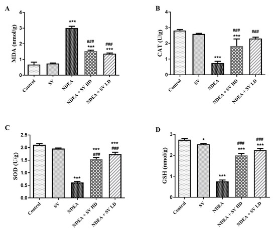 The anti-oxidants (GSH, SOD, and CAT) and the end products of polyunsaturated fatty acids peroxidation, MDA, were analyzed in liver homogenates using the ELISA technique. Results demonstrated in Figure 2 indicated that NDEA treatment induced a significant (at p < 0.05) level of MDA to 41%, which was concomitant with reduced (at p < 0.05) anti-oxidant markers in the present study, i.e., CAT (28.8%), SOD (31.2%), and GSH (30.15%), as compared with control non-treated rats. Conversely, the NDEA-co-treated rats with SV HD and SV LD displayed a significant reduction (at p < 0.05) of MDA to 50.8% and a significant elevation (at p < 0.05) in the anti-oxidant markers CAT (244 and 308%, respectively), SOD (245 and 283%, respectively), and GSH (261 and 294%, respectively) compared to the rats that received only NDEA. In addition, non-significant differences were observed in MDA and anti-oxidant markers between SV-only-treated rats, except for a significant reduction in GSH, compared to the control non-treated group and between NDEA + SV HD and NDEA + SV HD-treated groups (Figure 2A–D).
