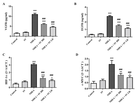 2.3. Effect of SV on EGFR and VEGFR Serum Level and Gene Expression of c-MYC and HIF-1α in the Presence or Absence of NDEA