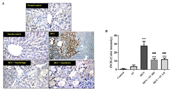 Effect of SV extract and/or NDEA on the liver tissue protein expression of iNOS figure (A) and color intensity (B). Tissues from control or SV control showing negative expression of iNOS. Rats treated with NDEA demonstrating increased expression of iNOS in the tumor cells in hepatic nodules (black arrows). Rats treated with NDEA + SV HD and NDEA + SV HD displaying noticeable reduction in iNOS expression in tumor cells of liver compared to NDEA-alone-administered rats. Where *** p < 0.001 are considered statistically significant compared to normal rats; ### p < 0.001 is considered statistically significant compared to NDEA-treated rats. Scale bar = 100 μm. SV, S. vermiculata extract; NDEA, N-diethylnitrosamine; NDEA + SV HD, N-diethylnitrosamine plus S. vermiculata extract (200 mg/kg); NDEA + SV LD, N-diethylnitrosamine plus S. vermiculata extract (100 mg/kg).