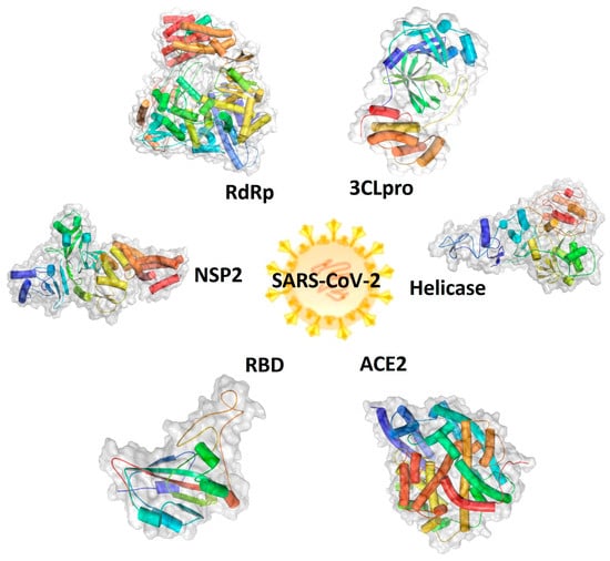 | ACE2 | RBD | Helicase | NSP2 | RdRp | 3CLpro | |