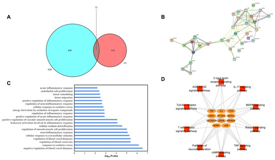 Venn diagram of overlapping (between PT and IDD) targets (A), PPI network of potential targets (B), GO BP enrichment results (C), and the pathway–target network (D).
