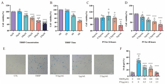 CCK-8 and SA-β-gal activity assay results. Cell viability was analyzed for NPCs treated with TBHP (concentration gradient = 0, 50, 100, 150, 200, and 250 μM) for 2, 4, and 6 h (A,B), or with PT (concentration gradient = 0, 0.5, 1, 2.5, and 5 μg/mL) for 24 and 48 h (C,D). * p < 0.05, *** p < 0.001, and **** p < 0.0001 vs. 0 μM or 0 h. (E) Representative SA-β-gal staining images of NPCs treated with TBHP, with or without PT. (F) Histograms of SA-β-gal activity in the three groups. Scale = 100 μm. Data are the mean ± standard deviation. #### p < 0.0001 vs. CTL group; **** p < 0.0001 vs. 100 μM TBHP group.