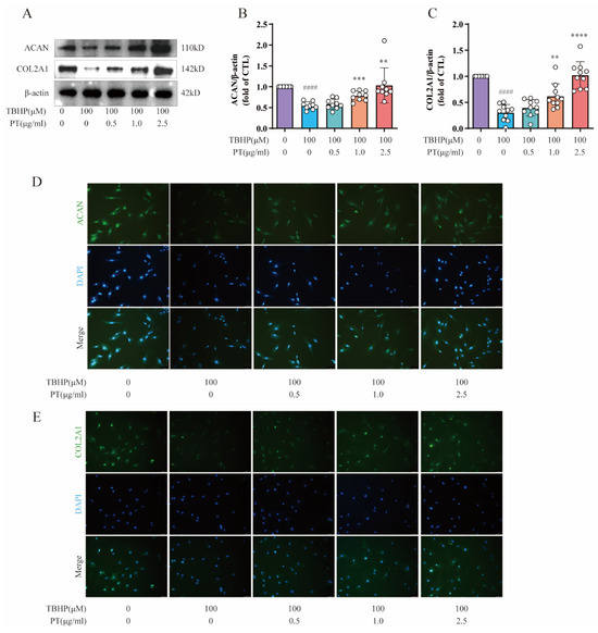 Expression of ACAN and COL2A1 in NPCs. (A) Expression of ACAN and COL2A1 proteins in NPCs treated with TBHP, with or without PT. (B,C) Expression of ACAN and COL2A1 proteins relative to β-actin in NPCs treated with TBHP, with or without PT. (D) Representative immunofluorescence images of ACAN in NPCs photographed by fluorescence microscopy (scale bar = 100 μm). (E) Representative immunofluorescence images of COL2A1 in NPCs photographed by fluorescence microscopy (scale bar = 100 μm). Data are the mean ± standard deviation. #### p < 0.0001 vs. CTL group; ** p < 0.01, *** p < 0.001, and **** p < 0.0001 vs. 100 μM TBHP group.