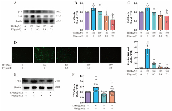 Detection of p16, IL6, TNF-α, and ROS levels in NPCs. (A) Expression of p16 and IL-6 proteins in NPCs treated with TBHP, with or without PT. (B,C) Expression of p16 and IL-6 proteins relative to β-actin in NPCs treated with TBHP, with or without PT. (D) ROS production in NPCs treated with TBHP, with or without PT. (E) Expression of TNF-α protein in NPCs treated with LPS, with or without PT. (F) Expression of TNF-α protein relative to β-actin in NPCs treated with LPS, with or without PT. Data are the mean ± standard deviation. # p < 0.05, ## p < 0.01 vs. CTL group; * p < 0.05, ** p < 0.01 vs. 100 μM TBHP or 1 μg/mL LPS group.