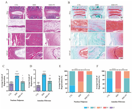 Histological staining results. Three-month-old wild-type C57BL/6 mice were randomly divided into three groups: CTL (n = 9), IDD (n = 6), and IDD+PT (n = 6). Representative HE (A) and safranin O/green-stained (B) images of intervertebral discs, and histograms generated via histological assessment (C–F) of the three groups. Scale bar = 200 μm. G1–G5 correspond to gradually increasing degeneration grades. ### p < 0.001, #### p < 0.0001 vs. CTL group; * p < 0.05, ** p < 0.01, *** p < 0.001, and **** p < 0.0001 vs. IDD group.