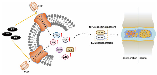 In this study, the TNF-α signaling pathway had the highest p-value (Table 2), indicating that PT may exert protective effects against IDD by regulating this pathway. Inhibition of the TNF-α signaling pathway attenuates IDD progression by reducing inflammation and oxidative stress [54]. We showed that inflammation-specific genes, including TNF-α, FOS, JUN, PTGS2 and EDN1, are enriched in the TNF signaling pathway. We also confirmed that PT can reduce the expression of these elements of the TNF-α signaling pathway, while increasing that of COL2A1 and ACAN in NPCs treated with TBHP.