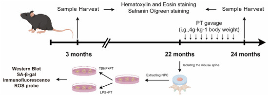 This research was approved by the Ethics Committee of our hospital (No. TCMF1-2019030), following the experimental designs (Figure 8). We bought randomly divided 3-month-old wild type C57BL/6 mice into three groups: control (CTL), IDD, and IDD with PT (IDD+PT). The animals were kept in a sterile environment with consistent light (12 h/day), temperature (21~26 °C), and humidity (41~70%) conditions, and were provided with adequate water and food. After 22 months, we obtained an IDD model of naturally aging mice according to a previous report [26].