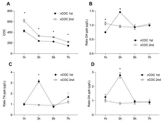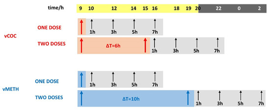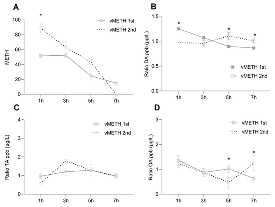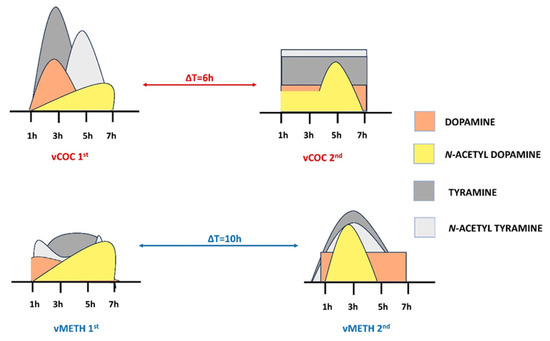 Thus, the important difference in the temporal profiles was that vCOC leads to large peaks of DA, OA and TA at three hours after the first administration which were absent after the vMETH administration. After the second administration of vCOC, concentrations of DA, OA and TA remained stable over time, while after administration vMETH levels were less stable and tended to increase at later time points (Figure S1 in Supplementary Materials).