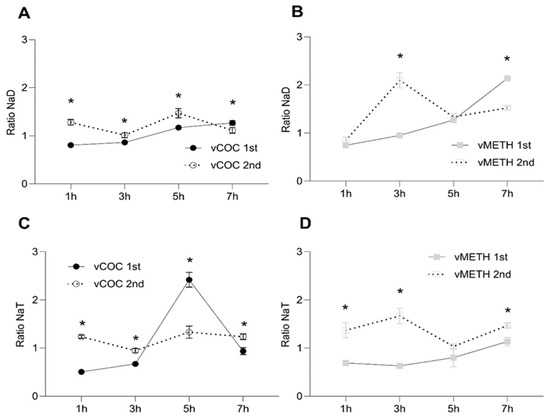 After the second vMETH administration, the levels of NaT were, overall, significantly higher than after the first administration, a profile that was distinct from vCOC (Figure 3C,D). A direct comparison of NaD concentrations after the first vCOC and vMETH exposures shows higher values for vMETH vs. after the second exposure (Figure S2 in Supplementary Materials). NaT concentration differed between vCOC and vMETH at five hours after the first exposure, where vCOC led to a spike, and after the second exposure at three hours when there was a spike after the vMETH exposure (Figure S2 in Supplementary Materials).