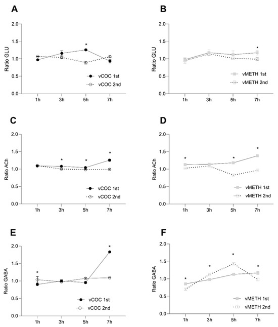 Changes in the concentration ratio of glutamate (GLU), acetycholine (ACh) and γ-aminobutyric acid (GABA) after one and two vCOC and vMETH administrations. The ratio of the relative proportion of GLU (A,B), ACh (C,D) and GABA (E,F) was measured in the extract of head homogenates at 1, 3, 5 and 7 h after one administration of vCOC or vMETH (each 75 μg) administered at 9:00, and two administrations (2 × 75 μg) at 9:00 and 15:00 for vCOC and (2 × 75 μg) at 9:00 and 19:00 for vMETH using the FlyBong method. Two-way ANOVA with Tukey’s multiple comparisons test. *: p < 0.05.