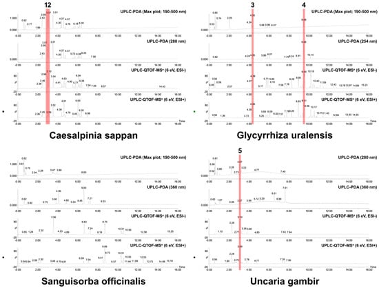 Representative UPLC chromatograms of 70% ethanol extracts (3 mg/mL) from selected medicinal plants. The tentatively identified compounds are as follows: (1) brazilin; (2) protosappanin B; (3) liquiritin apioside; (4) glycyrrhizin; (5) catechin. The analysis conditions were set as follows: column, ACQUITY UPLC BEH C18 1.7 μm column (2.1 × 100 mm); column temperature, 35 °C; flow rate, 0.4 mL/min; injection volume, 1 μL; detection wavelength, max plot (190–500 nm), 210 nm, 254 nm, 280 nm, and 360 nm. The mobile phase gradient conditions were set as described in Table S1.