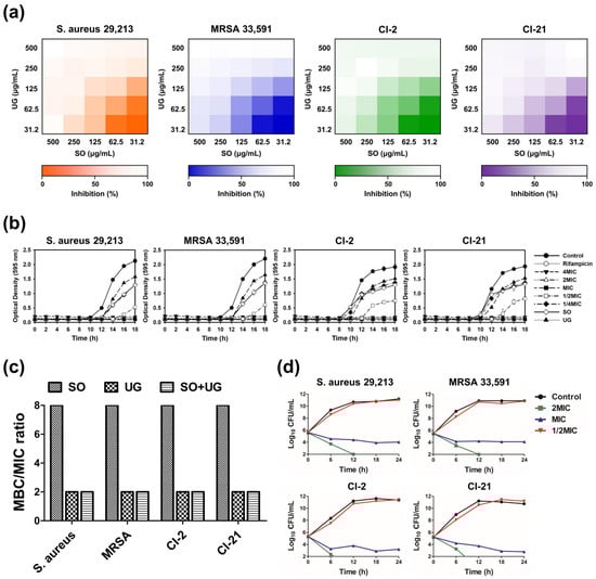 The SO + UG combination synergistically inhibits bacterial growth of MRSA isolates. (a) Heatmaps of checkerboard synergy assays for the SO + UG combination. The results are presented as the percentage of bacterial growth inhibition based on OD595 values. Darker regions represent higher bacterial cell density. (b) Influences of the SO + UG combination on bacterial growth of MRSA strains. The concentration of the individual extracts was 125 μg/mL (sub-MIC). (c) MBC/MIC ratio of SO, UG extracts alone, or their combination. (d) Time-kill curves of the SO + UG combination against MRSA strains. MBC/MIC ratio ≤ 4 and time-kill curves indicate bactericidal effects of the SO + UG combination following data in (c,d). All data are presented as mean ± standard deviations of experiments performed in triplicate, with p < 0.05 indicating statistical significance.
