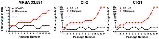 Antibiotics revolutionized the practice of medicine by providing a cure and decreasing the morbidity and mortality of numerous infectious diseases. However, these achievements are threatened by the emergence of antimicrobial resistance (AMR). AMR refers to the ability of microbial pathogens to avoid or delay death upon exposure to antibiotics predicted to kill them [63,64]. In multistep resistance selection experiments, we confirmed the ability of MRSA to develop resistance to the SO + UG combination and rifampicin after repeated exposures. MRSA strains were serially passaged at 24 h intervals in the presence of each sample for up to fourteen passages. The results are shown in Figure 5. The MRSA standard (ATCC 33,591) developed resistance to rifampicin after four passages with a 4-fold increase in MIC. MRSA isolates (CI-2 and CI-21) rapidly developed resistance to rifampicin after the second passage, with a 4-fold increase in MIC, respectively. After fourteen passages, the MIC of rifampicin for ATCC 33,591, CI-2, and CI-21 increased to 64, 1024, and 1024 folds, respectively. However, no resistance was observed for the SO + UG combination over the fourteen passages (MIC increased by up to 2-fold). These results indicate that MRSA strains could not easily develop resistance to the SO + UG combination. This could be due to the bactericidal activity of the SO + UG combination toward MRSA. Elimination of pathogens rather than inhibition eradicates the resistance mutations that could occur due to antibiotic pressure [65]. Thereby, plant extract combinations such as the SO + UG combination may be a promising candidate to overcome antibiotic resistance.