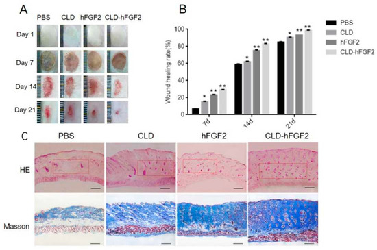 2.5. CLD-hFGF2 Freeze-Dried Powder Enhances Deep Second-Degree Burn Wound Closure in Rats