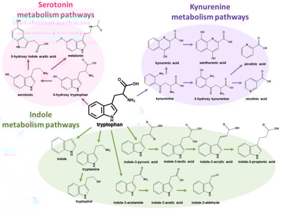- Agus, A.; Planchais, J.; Sokol, H. Gut Microbiota Regulation of Tryptophan Metabolism in Health and Disease. Cell Host Microbe 2018, 23, 716–724. [Google Scholar] [CrossRef]