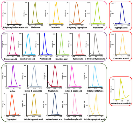 All authentic standards and chemicals were of analytical grade or better. All target metabolites (such as 5-hydroxyl indole acetic acid, melatonin, serotonin, 5-hydroxy tryptophan, tryptophan, indole, indole-3-acetamide, tryptamine, indole-3-acetic acid, indole-3-aldehyde, tryptophol, indole-3-pyruvic acid, indole-3-lactic acid, indole acrylic acid, indole-3-propionic acid, kynurenic acid, xanthurenic acid, picolinic acid, nicotinic acid, kynurenine, and 3-hydroxy kynurenine) were purchased from Sigma-Aldrich (St. Louis, MO, USA). Isotopically labeled internal standards (ISs), kynurenic acid-d5, tryptophan-d5, and indole-3-acetic acid-d2 were purchased from CDN Isotopes (Pointe-Claire, QC, Canada).