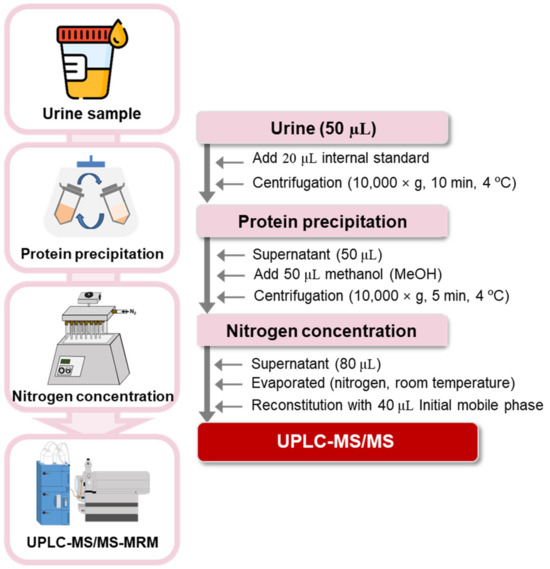 Collected urine samples were treated according to the method in a previous study [41] with minor modifications. Each frozen urine sample (50 μL) was thawed at room temperature (20–30 °C) and transferred to a 1.5 mL centrifuge tube, followed by the addition of 20 μL of IS solution (10 µg/mL mixture of kynurenic acid-d5, tryptophan-d5, and indole-3-acetic acid-d2). The sample mixture was vortex-mixed for 30 s and centrifuged at 12,000 rpm for 10 min. After centrifugation, the supernatant (50 μL) was transferred into a 1.5 mL centrifuge tube. For deproteinization, 50 μL of MeOH was added to the sample; the mixture was vortex-mixed for 30 s and centrifuged at 12,000 rpm for 5 min. After centrifugation, the supernatant (80 μL) was dried under a gentle stream of nitrogen gas. The dried residue was re-dissolved in 40 μL of a mixture of HFBA in de-ionized water (0.01%, v/v) and MeOH (95:5, v/v), followed by injection (10 μL) into the UPLC–MS/MS system. The overall analytical flow used to profile tryptophan metabolites in human urine samples is depicted in Figure 4.