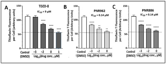 TDZD analogs PNR886 and PNR962 are more potent than TDZD-8 in reducing HEK-tau aggregation. HEK293-tau cells were cultured 48 h in the presence of the indicated doses of TDZD-8 (A), PNR962 (B), or PNR886 (C), displayed on a log(10) scale, comprising zero (controls), 1 nM, 10 nM, 1 µM, and (for TDZD-8) 10 µM. Cells were then stained with thioflavin T, and aggregate signal per cell was quantified from fluorescence images (see Materials and Methods). Significance of differences from controls (combined from two to four repeats) was assessed by two-tailed t tests, with nominal adjustment of the alpha level (α < 0.01) to compensate for multiple comparisons. ** p < 0.01, **** p < 0.0001. Based on fluorescence per cell at 1 nM (10−3 µM) of each drug, both PNR962 and PNR886 were significantly more effective than TDZD-8 at reducing tau-mediated aggregation (p < 10−4).
