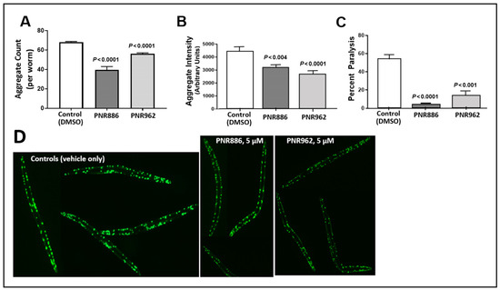 We next assessed whether PNR886 and PNR962 protect C. elegans from paralysis arising from aggregation, in C. elegans strain CL4176 (expressing human Aβ1–42 in body-wall muscle). Young adults accumulate amyloid plaque and undergo acute paralysis within two days after induction of Aβ1–42 synthesis in late larvae, just preceding the adult stage. Treatment with 10 µM PNR886 or PNR962, beginning at the L4 larval induction, reduced paralysis by >90% and >75%, respectively (Figure 3C).