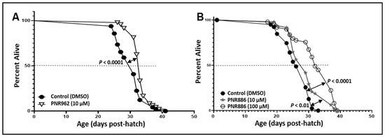 PNR886 and PNR962 extend lifespan of wild-type C. elegans. Lifespan survivals are shown for wild-type C. elegans (strain Bristol-N2, DRM lineage) exposed to (A) 10 µM PNR962 or (B) 10 or 100 µM PNR886, continuously from the L4/adult molt, replenished on fresh plates every other day. In each panel, drug treatments are compared to vehicle alone (controls) containing DMSO at the same final concentration as utilized in the drug plates. Worms (two plates of 25 worms per group, N ≈ 50) were maintained at 20 °C with ample E. coli (strain OP50) as food. Significance of survival differences, drug-treated vs. controls, were assessed by Gehan–Wilcoxon log-rank tests.