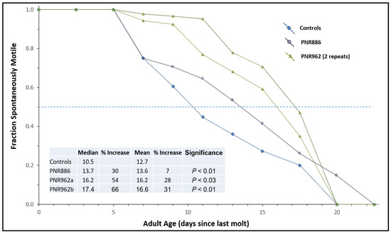 To assess “healthspan”, we employed an assay that we had developed previously [50] to monitor the age-dependent onset of paralysis in CL4176 adults carrying a transgene for muscle expression of Aβ1–42. In contrast to the previously shown experiment with this strain (Figure 3C), the Aβ1–42 transgene was never induced, allowing aggregation and paralysis to develop gradually as worms age (see control curve in Figure 5). PNR886 and PNR962 extended the median times to paralysis by 30% and 58%, respectively (Figure 5), consistent with their amelioration of age-dependent aggregation.