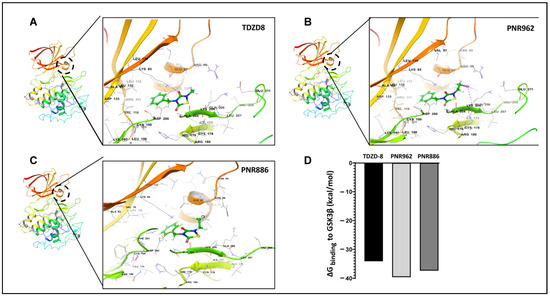 The implicit solvent-based binding free energies (ΔGbinding) of PNR962 and PNR886, docked to the allosteric pocket of GSK3β, were estimated from MM-GBSA simulations (molecular mechanics of the generalized Born model with solvent accessibility) [51]. PNR962 and PNR886 are predicted to have 3–6 kcal/mol greater binding affinity than TDZD-8 (Figure 6D).