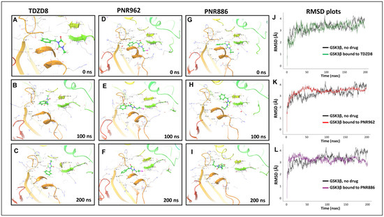Molecular-Dynamic simulations support stable binding of TDZD analogs TDZD-8, PNR886, and PNR962 to the hydrophobic pocket in inactive GSK3β. (A–I), Snapshots from 0.5-µs simulations of full-length GSK3β in the inactive conformation, bound to TDZD-8, PNR886, or PNR962; structural images were extracted at 0 ns, 100 ns, and 200 ns. (J–L), Root Mean Square Deviations (RMSD) time-courses of GSK3β::ligand complexes are plotted for simulations of GSK3β bound to TDZD-8, PNR886, or PNR962, each superimposed over the same no-ligand control simulation (black tracings). Replicate simulations produced similar results, reaching plateaus (indicating stable conformations) in <50 ns. Simulations were conducted in Schrödinger Maestro 11.4 (New York City, NY, USA).
