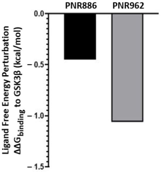 Since PNR886 and PNR962 are analogs of TDZD-8, we used in silico ligand exchange to reassess their relative binding affinities for GSK3β. Free-energy perturbation, conducted within the Schrödinger suite, predicts the net energy shift due to an instantaneous ligand exchange. Briefly, after calculating the binding energy for a GSK3β complex with TDZD-8, that ligand was virtually converted to either PNR886 or PNR962, and the free-energy shift (ΔΔG) due to that replacement was calculated. Both PNR886 and PNR962 are predicted to have negative ΔΔG, indicating that each exchange from the lead molecule (TDZD-8) would enhance the stability of the complex (Figure 8). This procedure supports the results of MM-GBSA (Figure 6D); in both methods, PNR962 had the greatest affinity for GSK3β, but PNR886 was also superior to TDZD-8.