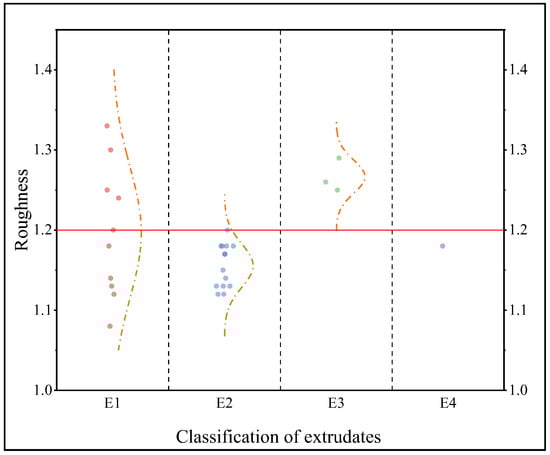 Scattering diagram of R for the four extrusions of the pure MCC prescription. (Notes—Roughness: surface roughness of the extrudates. E1: extrudate cannot be extruded smoothly, and the total amount of extrudate obtained is less than half of the amount fed. E2: extrudate can be extruded smoothly with a smooth surface. E3: extrudate can be extruded smoothly with rough surface. E4: extrudate can be extruded smoothly, but it is clumped together).