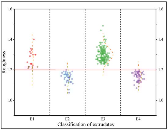 Scatter plot of R for the four extrusions of 300 prescriptions containing single TCM extracts (Notes—Roughness: surface roughness of the extrudates. E1: extrudate cannot be extruded smoothly, and the total amount of extrudate obtained is less than half of the amount fed. E2: extrudate can be extruded smoothly with a smooth surface. E3: extrudate can be extruded smoothly with rough surface. E4: extrudate can be extruded smoothly, but it is clumped together).
