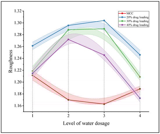 The surface roughness values of the extrudates of the MCC prescription and three loaded single TCM extracts prescriptions at four water addition levels were averaged. A line graph was created in order to clearly show the difference between the two model drugs, as shown in Figure 5.