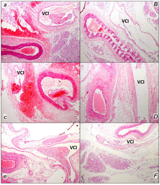 Thromboemboli presentation in vessels (a–F). In control rats, vascular thromboemboli presented within the lumen of large retroperitoneal vessels, abdominal aorta, and inferior vena cava (VCI) in all the time periods (15 min (a), 30 min (c), 60 min (e)) following laurate application into inferior caval vein. Thrombi consisted of fibrin and blood cells. In contrast, no thrombi were observed in treated animals. No thromboemboli were observed in BPC 157-treated group (15 min (B), 30 min (D), 60 min (F). (HE staining; magnification 100×; scale bar 200 μm).