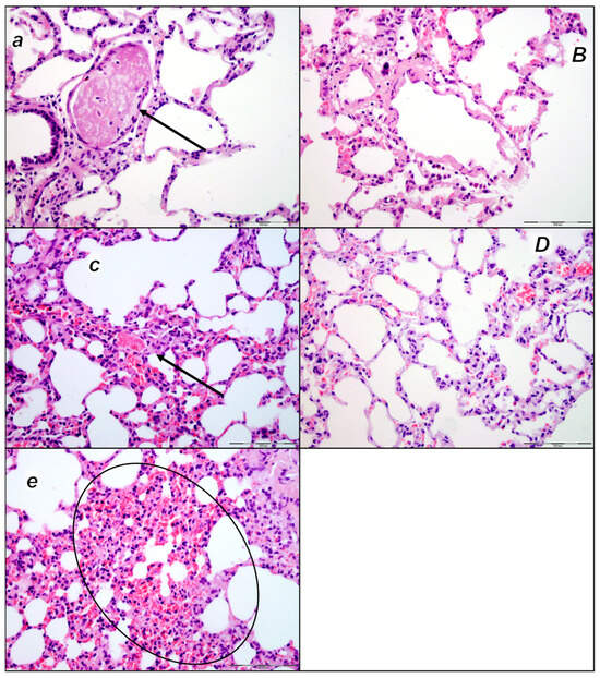 Thromboemboli presentation in lung (a–e). In control rats (small italic letters), thromboemboli (black arrow) were found within the lumen of medium and small lung and vascular vessels causing luminal occlusion, at two assessment time periods (30 min (a) and 60 min (c) following laurate application into inferior caval vein), with regional intraalveolar hemorrhagia (marked area) of lung parenchyma following thromboembolism after the time period of 60 min (e). Thromboemboli were absent in BPC 157-treated rats (capital italic letters) (30 min (B) and 60 min (D) following laurate application into the inferior caval vein. (HE staining; magnification 400×; scale bar 100 μm).