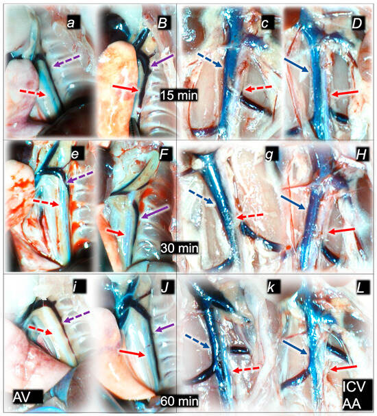 Illustrative presentation of azygos vein (AV) (violet arrows) and aorta (AA) in abdomen or thorax (red arrows) and inferior caval vein (blue arrows) (ICV) (a–L) in rats that received saline (control, small italic letters, dashed arrows) or BPC 157 therapy (capital italic letters, full arrows), immediately before sacrifice. Azygos vein and aorta at 15 min (a,B), 30 min (c,D), and 60 min (e,F) following application of 0.1 mL of sodium laurate (10 mg/kg) into the inferior caval vein. Inferior caval vein and abdominal aorta at 15 min (c,D), 30 min (g,H), and 60 min (k,H) following application of 0.1 mL of sodium laurate (10 mg/kg) into the inferior caval vein.