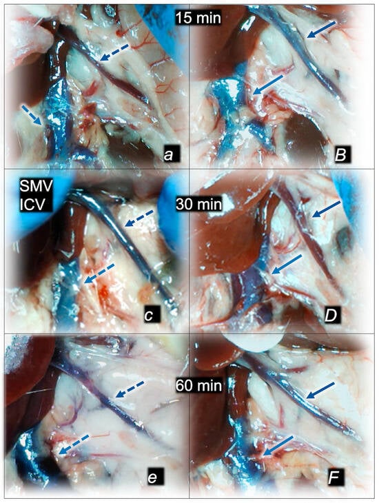 Illustrative presentation of superior mesenteric vein (SMV, dark blue arrows) and inferior caval vein (ICV, light blue arrows) (a,B,c,D,e,F) in rats that received 0.1 mL of sodium laurate (10 mg/kg) into the inferior caval vein, and then saline (control, small italic letters, dashed blue arrows) or BPC 157 therapy (capital italic letter, full blue arrows), immediately before sacrifice. Presentation at 15 min (a,B), 30 min (c,D), and 60 min (e,F) following application of 0.1 mL of sodium laurate (10 mg/kg) into the inferior caval vein.