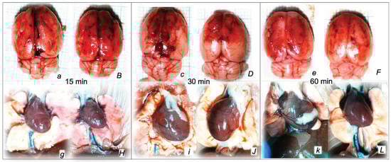 Illustrative presentation of brain (swelling) (a,B,c,D,e,F) and heart (dilatation) (g,H,i,J,k,L) in rats that in rats that received 0.1 mL of sodium laurate (10 mg/kg) into the inferior caval vein, and then saline (control, small italic letters) or BPC 157 therapy (capital italic letters). Presentation immediately after sacrifice (brain) or immediately before sacrifice (heart) at 15 min (a,B,g,H), 30 min (c,D,i,J) and 60 min (e,F,k,L) following application of 0.1 mL of sodium laurate (10 mg/kg) into the inferior caval vein.